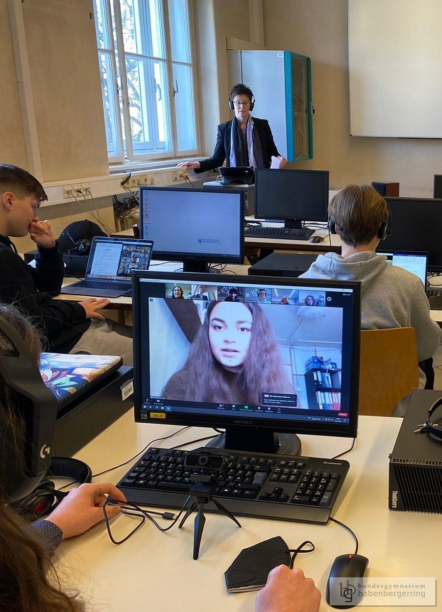 Im BG Babenbergerring in Wiener Neustadt steht der Russischunterricht in der 6C ganz im Zeichen der interkulturellen Kommunikation. Die Schülerinnen und Schüler bekamen die Adresse einer gleichaltrigen Kontaktperson in Russland und schlossen im Vorfeld bereits über WhatsApp Bekanntschaft. In der Russischstunde am 22.2.22 waren die Schülerinnen Mascha und Anna einer Schule in Ramenskoe bei Moskau live zugeschaltet. Mascha schaltete sich aus Sibirien im Haus ihrer Großmutter zu, die sie gerade besuchte. Die Schüler der 6C stellten eifrig ihre auf Russisch vorbereiteten Fragen. Der virtuelle Austausch fand bei allen Beteiligten großen Anklang.