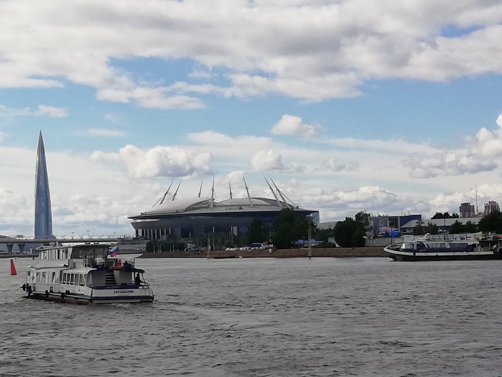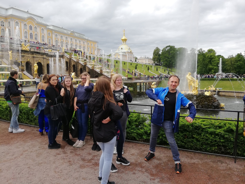 In gesamter Gruppengröße genossen wir auch eine exzellente Aufführung des Tschaikowskij-Balletts „Schwanensee“ im Michaijowskij-Theater, die uns alle sehr berührte, und unternahmen am kursfreien Samstag einen Ausflug nach Peterhof, in das „Versailles des Nordens“, die Sommerresidenz von Peter dem Großen mit ihren prächtigen Parkanlagen und grandiosen Wasserspielen. Schon die Fahrt dorthin mit dem Tragflügelboot die Newa entlang und über den Finnischen Meerbusen war ein Erlebnis und bot einen Blick auf das neue WM-Stadion und den mit 462 Metern höchsten Wolkenkratzer Europas, das Lachta-Center, die erst vor kurzem errichtete Firmenzentrale des Gazprom-Konzerns, deren Form an einen riesigen Maiskolben erinnert. Stanislaw führte uns auf Russisch durch die Anlage und unterhielt uns prächtig mit anschaulichen kleinen Anekdoten aus der Zarenzeit.