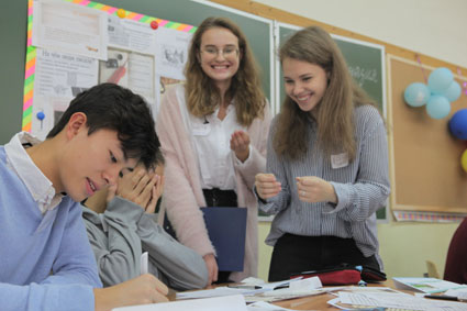 Was ist Zusammenarbeit? Nun, meiner Meinung nach ist Zusammenarbeit, wenn zwei wildfremde Personen in drei Sprachen versuchen, eine Aufgabe zu erledigen. Genau dies wurde uns an dem heutigen Tag in der Schule „Ramenki 1434“ als Aufgabe gegeben. Wir sollten uns neben eine/n russische/n Schüler/in setzen und Informationen über den Gegenüber herausfinden, wie z. B. Hobbys oder Lieblings-fächer. Am Anfang stand ich dieser Aufgabenstellung recht skeptisch gegenüber, doch mit der Zeit bereitete es mir eine große Freude, mit meinem weiblichen Gegenüber zu arbeiten. Ich brachte ihr etwas auf Deutsch bei, sie mir wiederum etwas auf Russisch. Englisch diente hier als eine Art Vermittlungssprache, mit der wir eventuelle Vokabellücken auffüllen konnten.