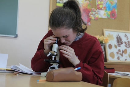 Das Beobachten einer Zelle durch ein russisches Mikroskop – wer hat das schon erlebt – ist etwas Neues für mich. Die rosafarbenen Formen, umgeben von russischem Fachvokabular, zu suchen ist eine Herausforderung, und wenn man die Zellen dann sieht, ist es um so lohnender.
