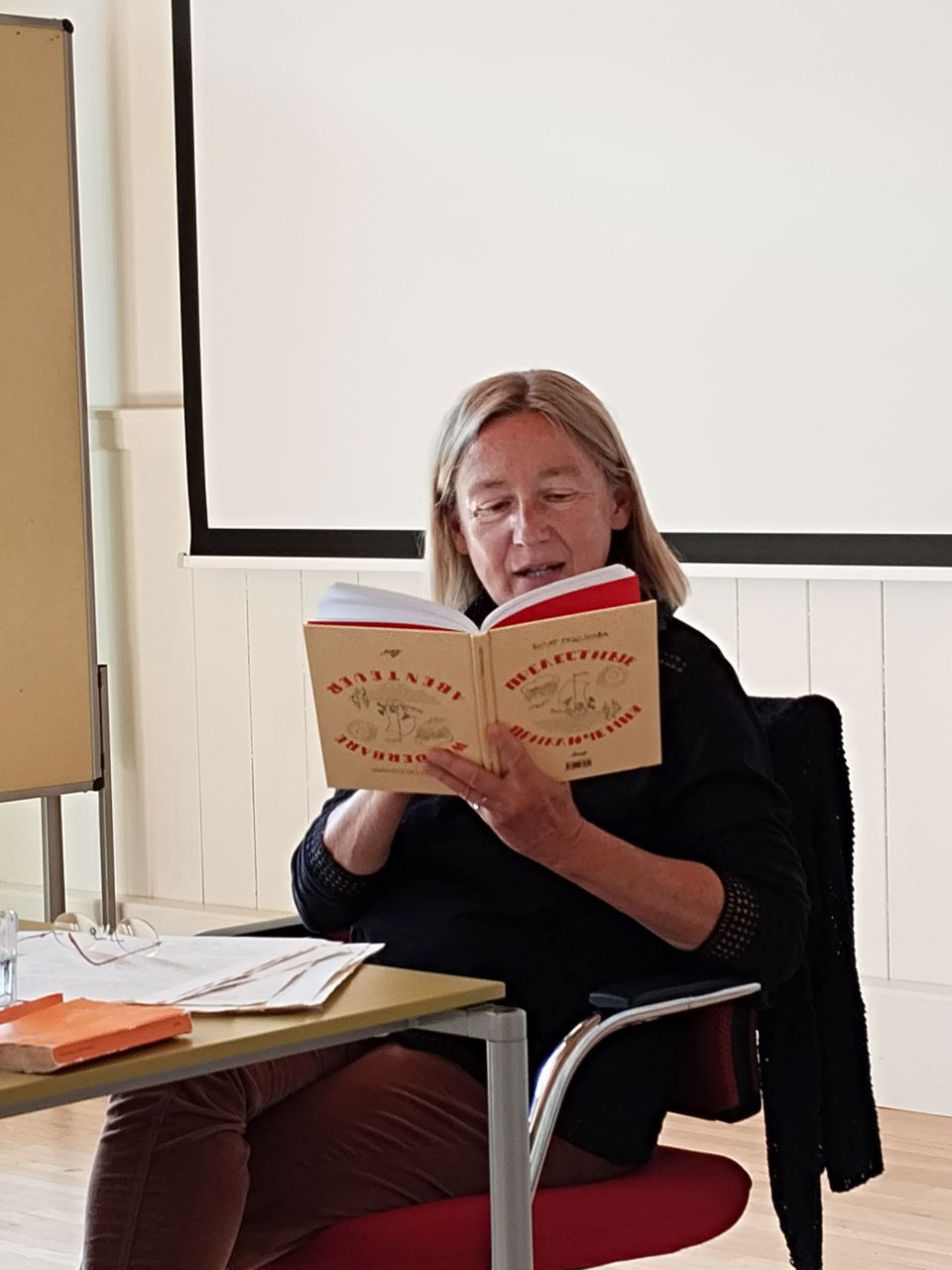 Jekatherina (Katja) Lebedewa, Universität Heidelberg, Professorin für Übersetzung Russisch, erzählte von ihrer Begeisterung für literarisches Übersetzen. Sie konnte als Studentin in der DDR Bulat Okudžava kennen lernen und verfasste ihre Dissertation zum Thema „Komm Gitarre, mach mich frei. Russische Gitarrenlyrikin der Opposition. 22 hist.OA von 1916 bis 1988“ (Berlin 1992). Ihre Mutter war 1934 in der UdSSR geboren worden, nachdem ihre Eltern vor dem Nationalsozialismus 1934 emigriert waren. Ihr Großvater, der in Wien Medizin studiert hatte und in Moskau als Chirurg arbeitete, wurde 1941 vom NKWD (Vorläufer des KGB) erschossen, weil er in der Bibliothek mit verschiedenen Menschen in mehreren Sprachen gesprochen hatte. Lebedewas Vater war Leningrader.