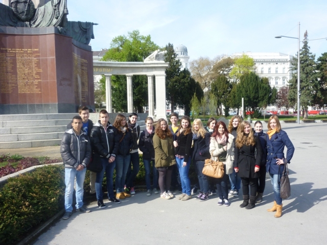В пятницу, 13.4.2012 мы посетили памятник войнам советской армии и посмотрели финал конкурса „Sprachmania“.Сначала мы поехали на электричке до станции „Rennweg“, а потом на трамвае до остановки „Schwarzenbergplatz“. Там мы участвовали в викторине. Один вопрос был: «Когда в России празднуют День Победы» - 9. Мая. Я не знала, что Сталина на самом деле зовут Иосиф Виссарионович Джугашвили. В то время как мы читали слова на цоколе памятника, русский посол и полиция фотографировали памятник. Фасад и цоколь были залиты краской.