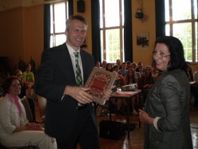- Frau Botschaftsrätin MiÅ¡ukovskaja überreicht Dir. Jaretz ein bibliophiles Geschenk, links Mag. Schevergina