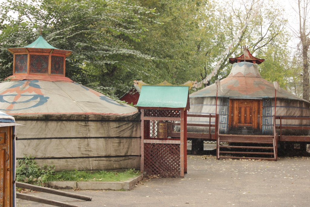 Heute, am 10. Oktober, haben wir das Freilichtmuseum der Nomadenkultur besichtigt. In der Russischen Föderation leben über 100 Völker, darunter auch Nomaden. Dort werden Tipis, mongolische Jurten und ein buddhistischer Tempel ausgestellt. Alle Exponate entstammen der zeitgenössischen Kultur der Nomadenvölker aus verschiedenen Erdteilen und durften nicht nur besichtigt, sondern auch angegriffen werden. In einem Tipi der Nenzen, in dem im Alltag etwa 7 Personen leben, befinden sich Gegenstände, deren Bestandteile von erlegten Rentieren stammen (Stoffe aus dem Fell, Werkzeuge aus Knochen und Hörnern). Je ein Schülerpaar durfte in die Nationaltrachten bzw. in das Alltagsgewand eines der Völker schlüpfen und so die Nomadenkultur hautnah erleben. Unser Führer, ein Anthropologe, spielte auf verschiedenen Musikinstrumenten (Trommeln, Streich- und Blasinstrumenten) und zeigte uns, wie sich Schamanen in Trance singen.