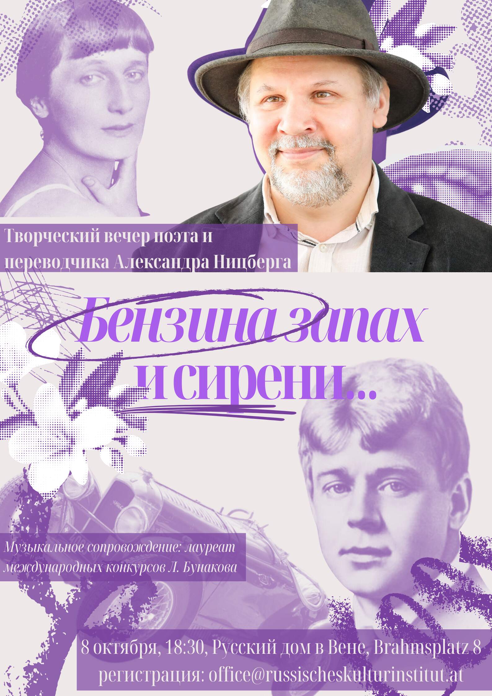 Российский центр науки и культуры приглашает 8 октября в 18:30 посетить творческий вечер известного поэта и переводчика Александра Ницберга «Бензина запах и сирени…Русская поэзия Серебряного века».