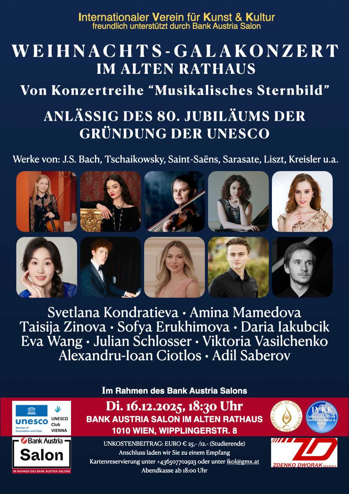 Sofya Erukhimova Klavier wurde 2007 in Russland geboren; ab ihrem 5. Lebensjahr studierte sie an der Kinderkunstschule in Nischni Nowgorod (Klasse von Prof. Tatiana Schikunova), dann an der Zentralen Musikschule des Moskauer Konservatoriums (Klasse von Natalia Bogdanova). Seit 2022 studiert sie im Vorbereitungslehrgang an der Universität für Musik und darstellende Kunst Wien bei Vladimir Kharin. Sie ist Preisträgerin und Gewinnerin von mehr als zwanzig internationalen Wettbewerben, darunter “Piano Talent” Wettbewerb in Milan, Orbetello-Klavierwettbewerb Junior, Festival-Wettbewerb für Pianisten “Villahermosa“ in Mexiko, Scherzo Klavierwettbewerb in Tel Aviv, Jenö Takács Klavierwettbewerb in Oberschützen, Young Virtuosos Wettbewerb in Sofia, MozArte Klavierwettbewerb Junior in Aachen, “Danubia Talents” Wettbewerben in Budapest, Bela Bartok Klavierwettbewerb in Graz. Sofya wurde die Landessiegerin in Landeswettbewerb Prima la Musica Wien 2024 und 2025. Sie ist Stipendiatin der “New Names“ Foundation (Russland).Sofya trat auf den Bühnen des Rachmaninow- und Kleinen Saals des Moskauer Konservatoriums sowie des Großen und Metallenen Saals des Wiener Musikvereins, des Wiener Saals des Mozarteums und und des Kleinen Saals des Concertgebouws auf. Sie spielte mit dem Kammerorchester “Solisten von Nischni Nowgorod”, mit den akademischen Symphonieorchestern von Nischni Nowgorod und Lipezk, Kammerorchester Lyra Wien und mit dem “Master Orchestra” auf dem “Talent Summer Music Festival” in Bresia. Sie tritt regelmäßig in verschiedenen Kammerensembles auf. Unter anderem gab sie als Mitglied des „Young Masters Piano Trios” mit Mariam Abouzahra und Konrad Varga ein Konzert in Wiener Musikverein. Sofya gab Solokonzerte innerhalb des Festivals “Concerti del Tempietto“ in Rom…