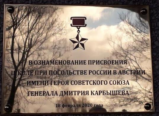 Die Schule der Russischen Botschaft in Wien wurde nach dem in Mauthausen zu Tode gekommenen General D.M. Karbyschev umbenannt.