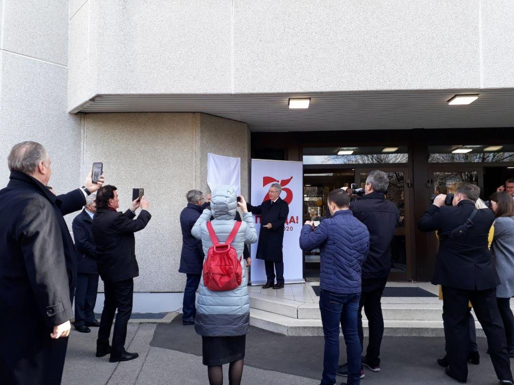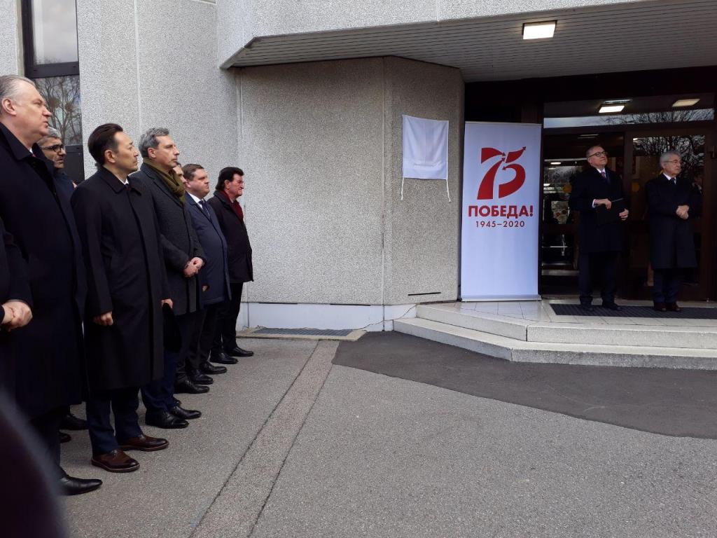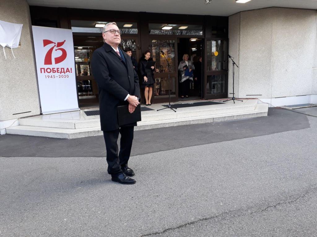 Botschafter D.E. Ljubinskij begrüßte den ehem. Präsidenten Österreichs Heinz Fischer und die Botschafter der Gemeinschaft Unabhängiger Staaten (GUS) zur Gedenkfeier. Botschafter Ljubinskij, Präsident Fischer und der Enkel Gen. Karbyschevs enthüllten eine Gedenktafel neben dem Eingang der Schule.