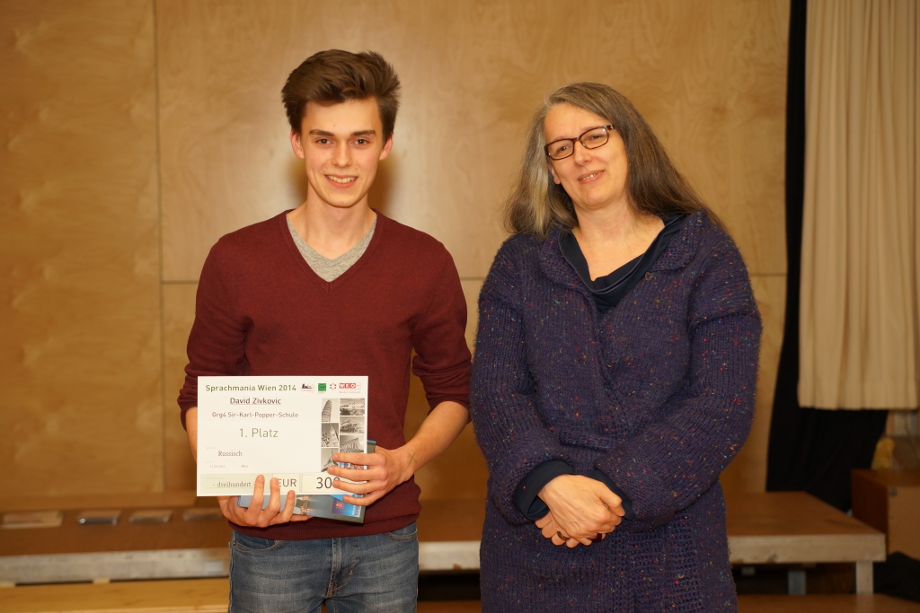 Die Preisverleihung nahmen Mag. Waltraud Mori, SSR Wien, und Dr. P. Sebastian Hacker, Obmann des Russischlehrerverbands, vor. Dr. Michaela Mayrus von der Wirtschaftskammer Wien war verhindert, übergab aber davor die gut dotierten Preise der Wirtschaftskammer Wien (WKW). Sie stellte 300 EUR für den ersten Platz, 200 für den zweiten, 100 für den dritten, 50 für den vierten Platz im Bereich des Pflichtfaches Russisch, d.h. 4 bis 6 Jahre Lernjahre Russisch, und 50 EUR für das Wahlpflichtfach (3 Lernjahre zu je 2 Stunden) zur Verfügung.